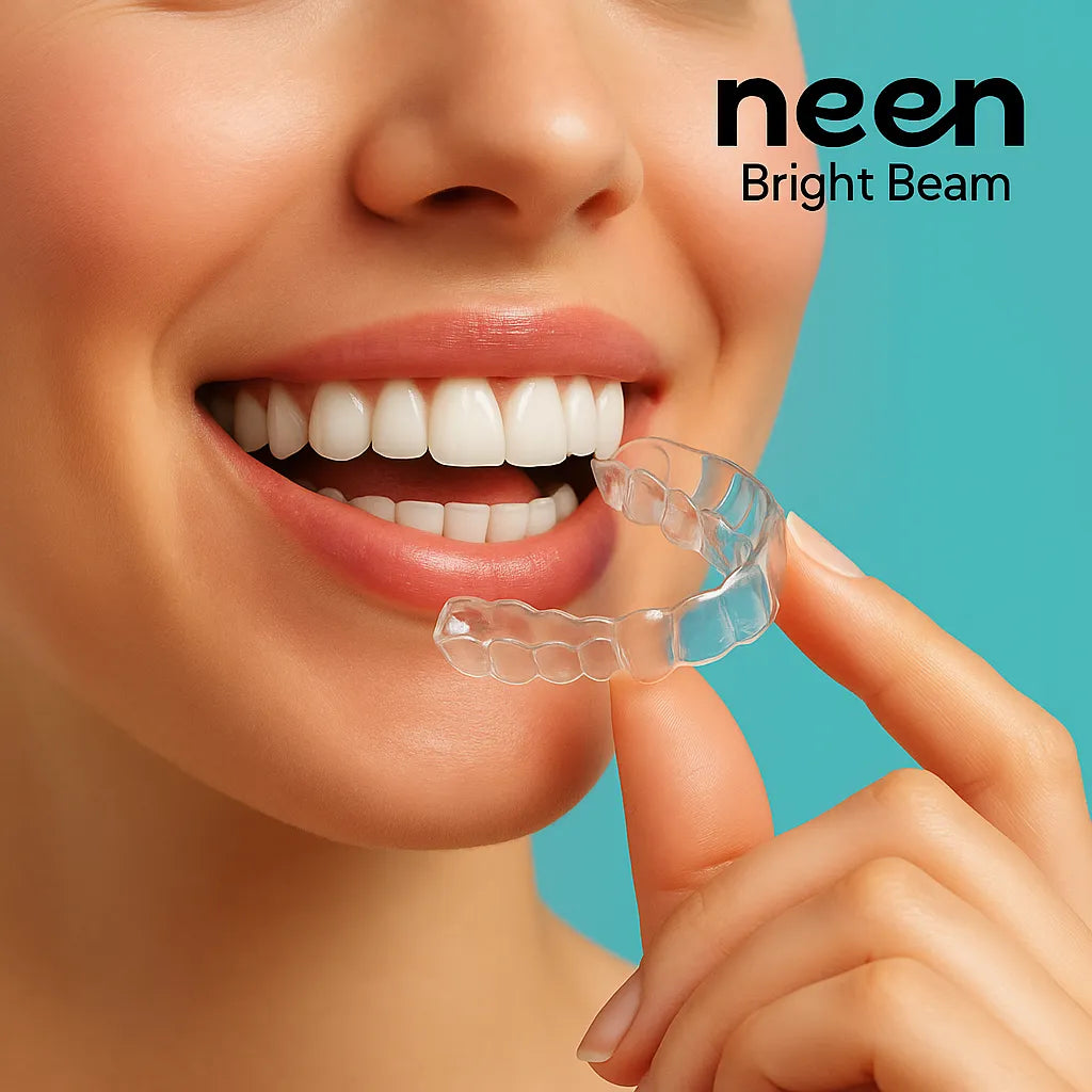 Bright Beam vine cu gutiere termoformabile care se mulează perfect pe dinții tăi, oferind o potrivire personalizată, ca în cabinet.